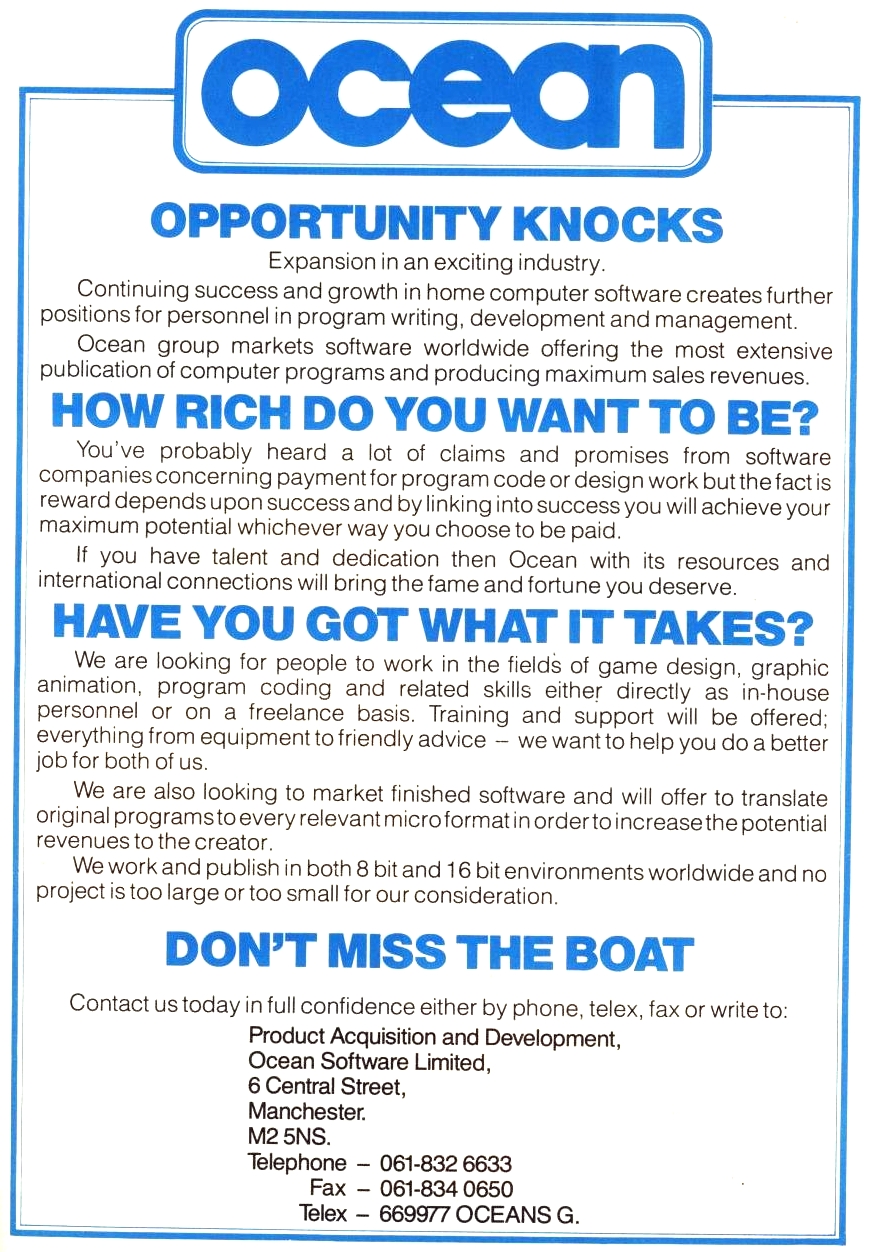 Fomos, durante duas décadas, bombardeados com anúncios aos seus jogos em todas as publicações da especialidade. Bastava apenas o logótipo da Ocean estar estampado na capa do jogo para vender milhões de unidades, tal era a qualidade desta marca.